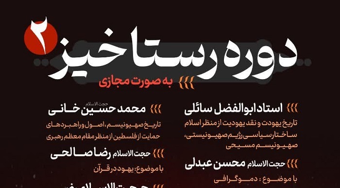 موسسه مطالعات راهبردی مسری با همکاری دانشگاه باقرالعلوم، دوره آموزشی آنلاین «رستاخیز۲» با سرفصلهای جامع پیرامون فلسطین، یهودیت و تاریخ صهیونیسم را از ۱۷ تا ۲۳ بهمن ماه برگزار کرد.