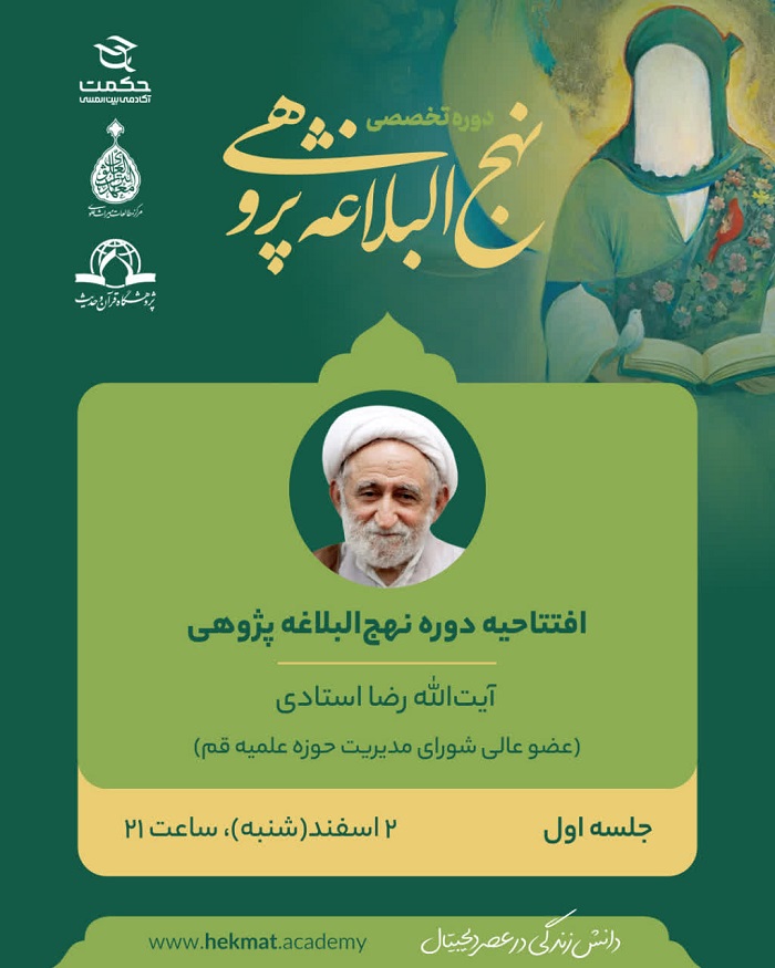 اولین جلسه از دوره تخصصی «نهجالبلاغهپژوهی» با سخنرانی آیتالله رضا استادی، عضو عالی شورای مدیریت حوزه علمیه قم، در ماه مبارک رمضان (۲ اسفند) برگزار شد. این نشست که به صورت حضوری در مرکز مطالعات میراث علوی برگزار گردید، ساعت ۲۱:۰۰ آغاز شد. به اطلاع علاقهمندان میرسد که جلسه مذکور پس از تدوین، در صفحه اختصاصی دوره بارگذاری خواهد شد و محدودیت زمانی برای مشاهده جلسات وجود ندارد. علاقهمندان میتوانند برای مشاهده جلسه و اطلاعات بیشتر به صفحه دوره به آدرس hekmat.academy/courses/nahj-al-balagha-studies مراجعه نمایند.
