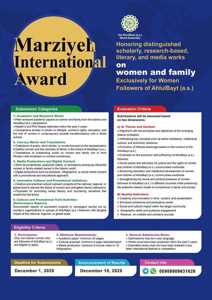 اداره زنان و خانواده مجمع جهانی اهلبیت(ع) جایزه بینالمللی «مرضیه» را با هدف تجلیل و تکریم از آثار علمی، پژوهشی، ادبی و رسانهای با موضوع زنان و خانواده برگزار میکند.