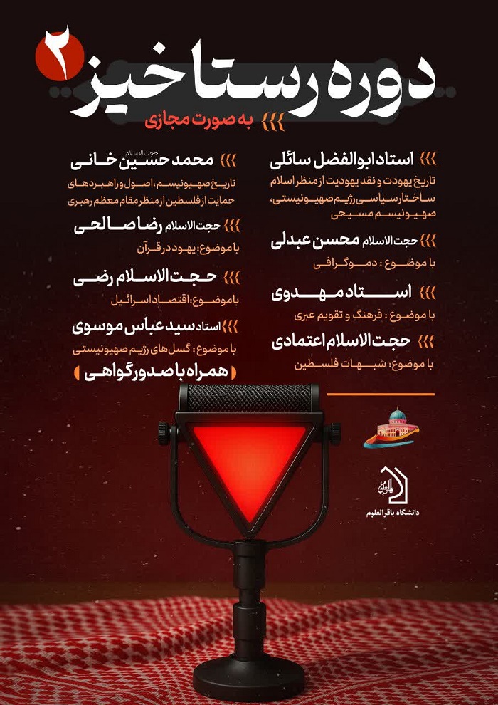 موسسه مطالعات راهبردی مسری با همکاری هسته مطالعات فلسطین دانشگاه باقرالعلوم، دوره آموزشی بصیرتی «رستاخیز۲» را با هدف تعمیق شناخت در حوزه فلسطین اشغالی برگزار نمود.