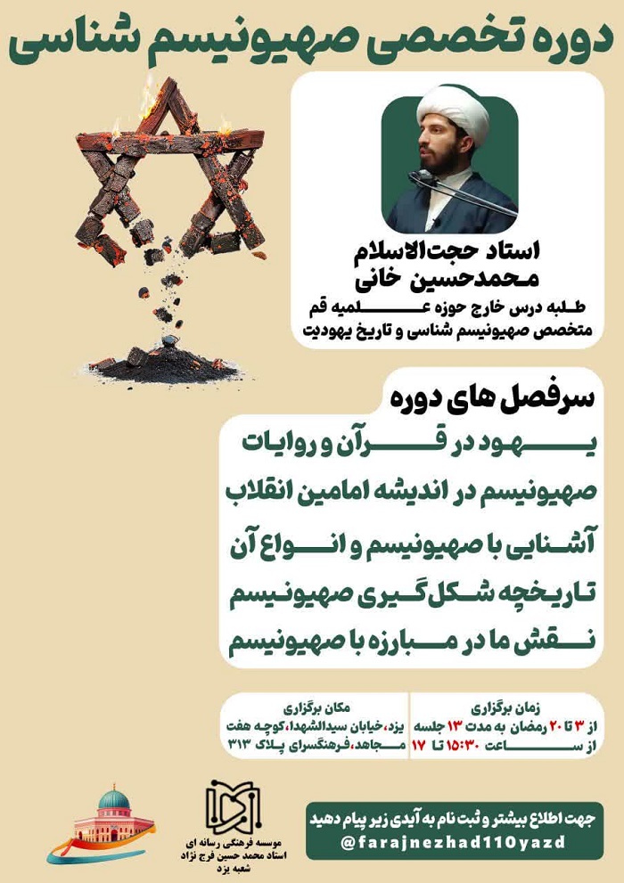 مؤسسه فرهنگی رسانهای استاد محمدحسین فرجنژاد در یزد با همکاری موسسه مسری، دوره تخصصی «صهیونیسمشناسی» را برگزار میکند. این دوره با تدریس حجتالاسلام محمدحسین خانی، طلبه درس خارج حوزه علمیه قم و متخصص صهیونیسمشناسی و تاریخ یهودیت، برگزار خواهد شد. زمان برگزاری دوره از ۳ تا ۲۰ ماه مبارک رمضان، به مدت ۱۳ جلسه، هر روز از ساعت ۱۵:۳۰ الی ۱۷ تعیین شده است. مکان برگزاری دوره در یزد، خیابان سیدالشهداء، کوچه مجاهد، فرهنگسرای پلاک ۳۱۳ میباشد. علاقهمندان میتوانند برای کسب اطلاعات بیشتر با شماره ۰۹۱۳۵۱۴۳۲۵۶ تماس بگیرند یا به آیدی @farajnezhad110yazd پیام دهند.