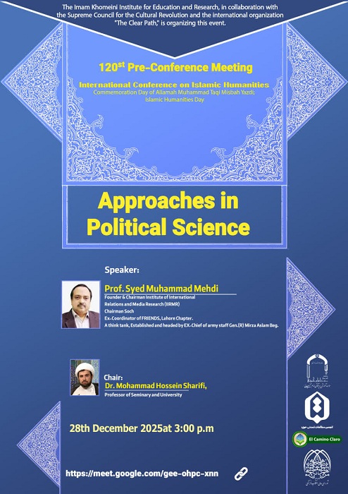 این پیشنشست با عنوان «رویکردهای علوم سیاسی» و با ارائه پروفسور سید محمد مهدی، بنیانگذار و رئیس مؤسسه روابط بینالملل و تحقیقات رسانهای پاکستان (IIRMR)، برگزار خواهد شد.