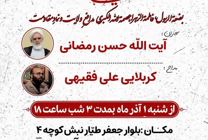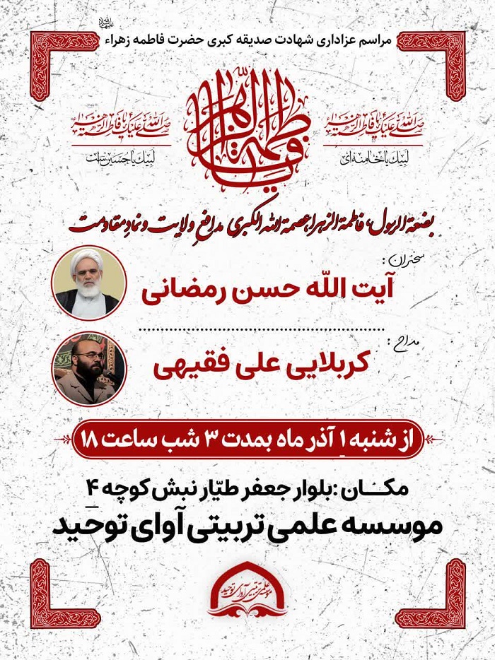 مؤسسه آوای توحید به مناسبت ایام فاطمیه دوم و سالروز شهادت حضرت فاطمه زهرا (س)، ویژهبرنامهای را از روز شنبه اول آذرماه آغاز میکند. در این مراسم که طی سه شب برگزار خواهد شد، آیتالله رمضانی به ایراد سخنرانی میپردازد و کربلایی علی فقیهی نیز مداحی خواهد کرد.