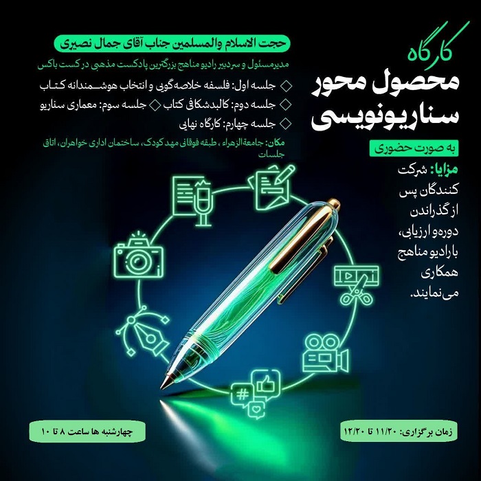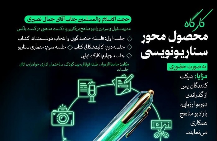 کارگاه ارتقایی پیشرفته و محصولمحور سناریونویسی به صورت حضوری و رایگان برای طلاب رسانهای و فعالان فضای مجازی که دغدغه جهاد تبیین رسانهای پسااغتشاشات را دارند، برگزار میشود. مدرس این کارگاه حجتالاسلام والمسلمین جمال نصیری است. این دوره در ۴ جلسه دوساعته، روزهای چهارشنبه از ساعت ۸ تا ۱۰ صبح، از ۲۰ بهمن تا ۲۰ اسفندماه، در محل ساختمان اداری خواهران (روبروی آموزشگاه امام رضا(ع)، طبقه فوقانی مهدکودک، اتاق جلسات) برگزار خواهد شد. از مزایای دوره، امکان همکاری پس از پایان دوره، تشکیل پرونده و دریافت هدیه رهبری است. ثبتنام از طریق لینکهای اعلامی و تماس با شماره ۰۲۵۳۲۱۱۲۰۹۳ امکانپذیر است.