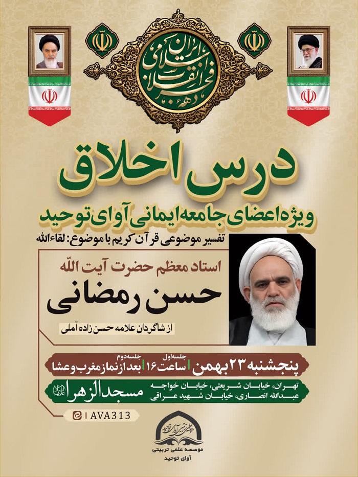 موسسه آوای توحید شعبه تهران، مراسم درس اخلاق و تفسیر موضوعی قرآن با موضوع لقاءالله را با سخنرانی آیت‌الله حسن رمضانی برگزار می‌کند.