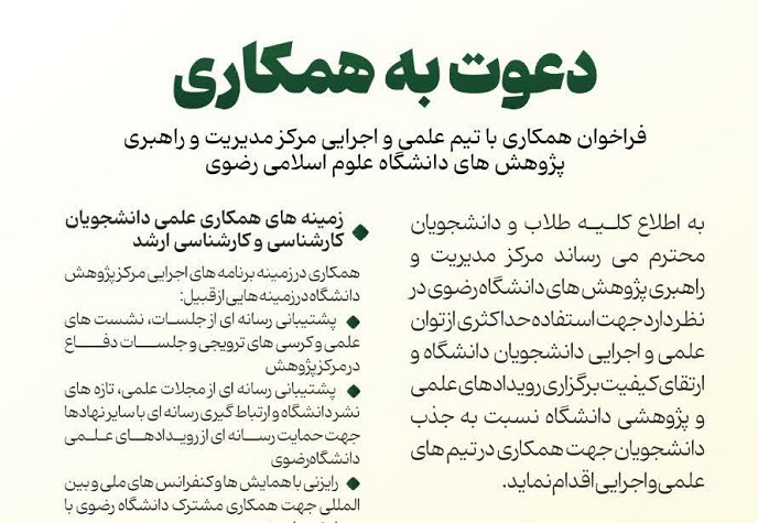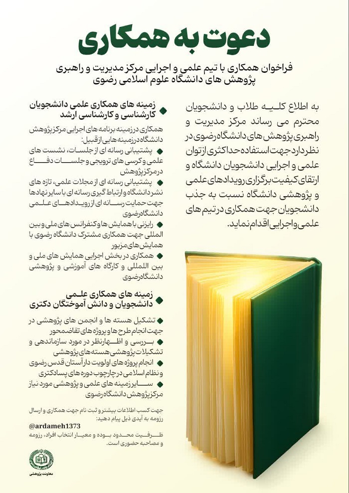 به منظور ارتقاء کیفی و اجرایی برنامههای علمی و پژوهشی دانشگاه علوم اسلامی رضوی، مرکز مدیریت و راهبری پژوهشهای دانشگاه فراخوان جذب نیرو جهت همکاری در قالب تیمهای علمی و اجرایی را اعلام کرد. این فراخوان شامل فرصتهای همکاری متناسب با مقاطع مختلف تحصیلی است.