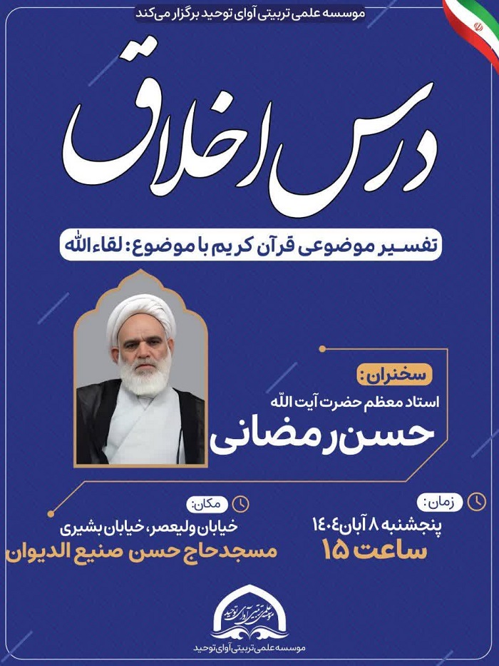 مؤسسه آوای توحید شعبه تهران در راستای فعالیتهای آموزشی و ترویج فرهنگ اسلامی، جلسات درس اخلاق و تفسیر موضوعی قرآن کریم را با حضور پرشور جامعه ایمانی آوای توحید برگزار مینماید.