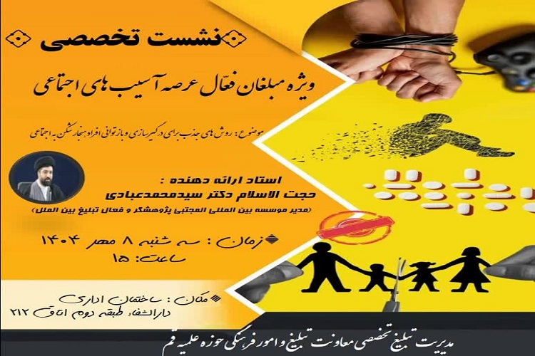نشست تخصصی «روشهای جذب برای درگیرسازی و بازتوانی افراد هنجارشکن به اجتماع»، به همت فعالان حوزه آسیبهای اجتماعی و با هدف ارتقای دانش و مهارتهای مبلغان در این عرصه حساس، برگزار میگردد. این نشست، که به صورت حضوری و مجازی قابل شرکت است، به تحلیل راهبردهای مؤثر تبلیغی در مواجهه با چالشهای اجتماعی و بازپروری افراد آسیبدیده میپردازد.