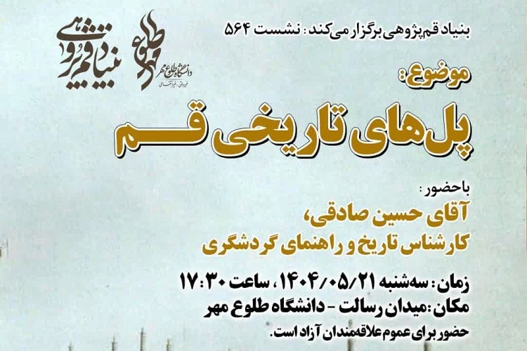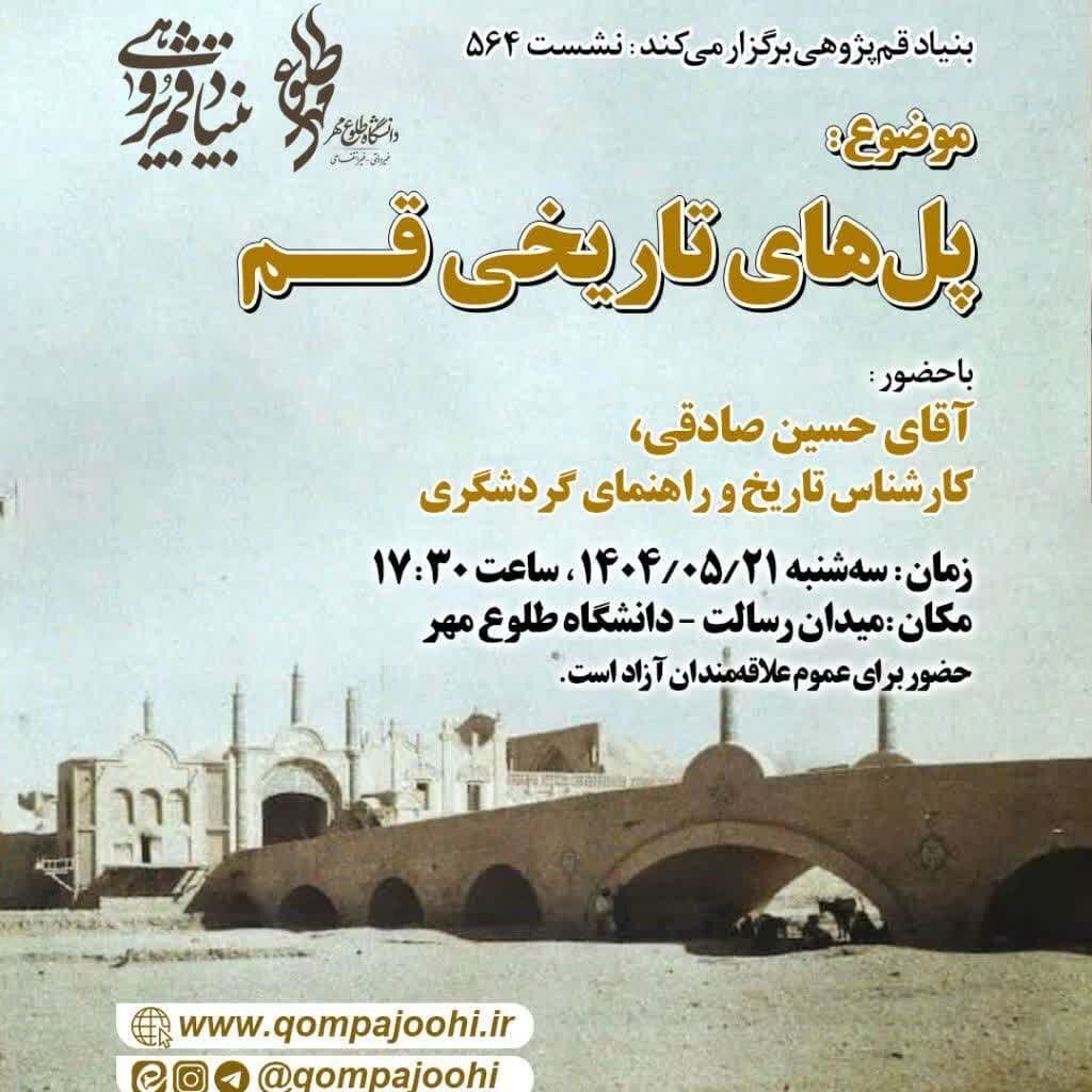 پنجاه و ششمین جلسه از سلسله نشستهای بنیاد قمپژوهی، با تمرکز بر یکی از جنبههای مهم تاریخی و معماری شهر قم، یعنی «پلهای تاریخی» برگزار میگردد. در این نشست که با حضور آقای حسین صادقی، کارشناس باسابقه تاریخ و راهنمای گردشگری، همراه خواهد بود، ابعاد مختلف تاریخی، معماری و اهمیت این سازههای کهن مورد بحث و بررسی قرار خواهد گرفت.