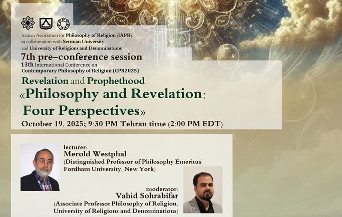 هفتمین پیشنشست از سلسله نشستهای علمی «فلسفه و وحی» با همکاری دانشکده ادبیات و علوم انسانی دانشگاه ادیان و مذاهب و انجمن فلسفه دین ایران برگزار میشود. موضوع این نشست «فلسفه و وحی؛ چهار چشمانداز» است و در آن اندیشههای نوینی در پیوند میان فلسفه و وحی مورد بررسی قرار خواهد گرفت.