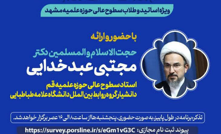 پنجمین مدرسه فصلی فقه نظامات اجتماعی با محوریت «فقه سیاست خارجی و روابط بینالملل» در مدرسه فقاهت عالم آل محمد آستان قدس رضوی ویژه اساتید و طلاب سطوح عالی حوزه علمیه مشهد برگزار می گردد .