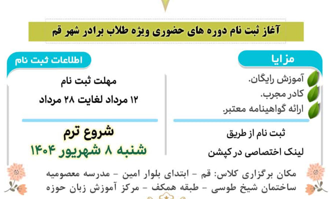 مهلت ثبت نام:از ۱۲ تا ۲۸ مرداد شروع ترم حضوری طلاب برادر : شنبه ۸ شهریور ۱۴۰۴ مکان برگزاری:ابتدای بلوار امین، مدرسه معصومیه، مرکز آموزش