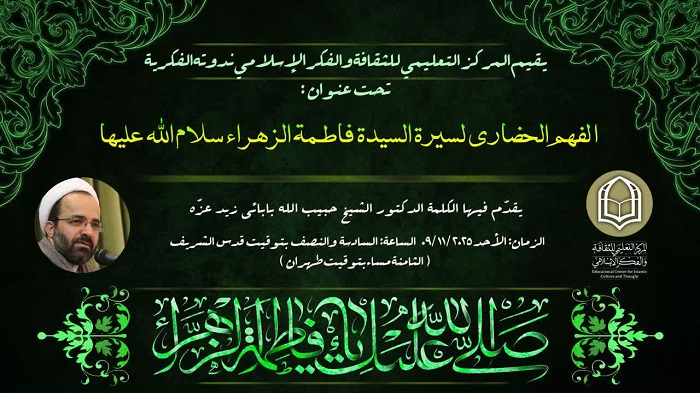 مرکز التعلیمی للثقافه والفکر الإسلامی نشستی تحلیلی با عنوان «الفهم الحضاری لسیره السیده فاطمه الزهرا سلام الله علیها» برگزار میکند.